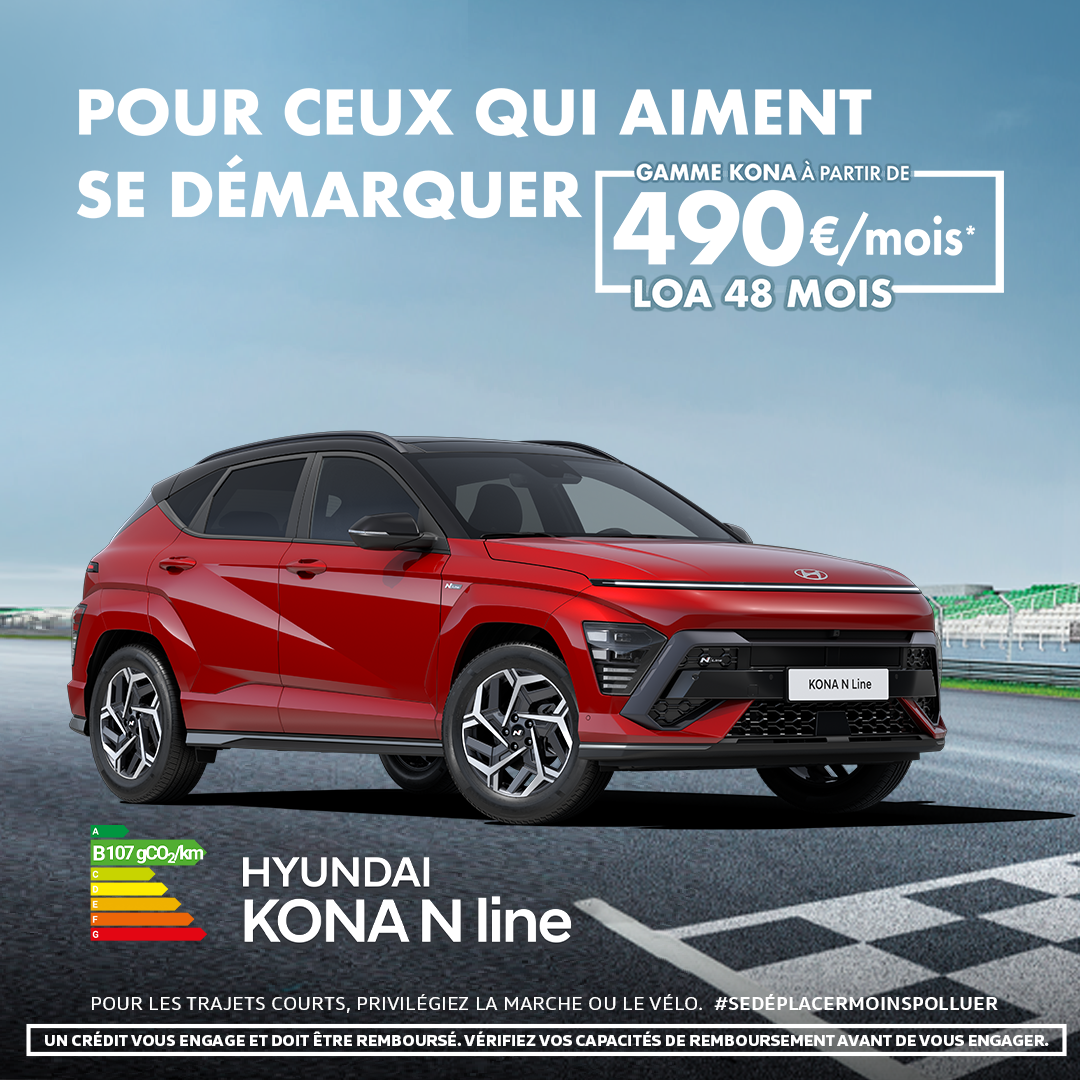 Hyundai Kona HEV Créative 1.6L 129CH DCT-6 consommation 4.7l / 100 km neuf en LOA avec option d'achat de 34450€ pour 45000 km maximum sur 48 mois. 1er loyer de 3000€ suivi de 47 loyers mensuels de 490€ hors assurance facultative, option d'achat finale de 16536€, soit un montant total dû sans option d'achat finale de 26159€ hors assurance facultative (dont 157,25€ de frais de dossier). Montant total dû avec option d'achat finale de 42695€ hors assurance facultative (dont 157,25€ de frais de dossier). Le coût mensuel de l'assurance facultative Décès, Perte Totale et Irréversible d'Autonomie, Incapacité Temporaire Totale de travail, souscrite auprès de Cardif Assurance Vie et Cardif Assurance Risques Divers, est de 35,853€ par mois qui s'ajoute au montant du loyer ci-dessus. Loyer arrondi à l'euro supérieur. Valable pour toute commande jusqu’au 31/12/2025. Offre réservée aux particuliers. Offre non cumulable avec toute autre offre pendant la période indiquée. Dans la limite des stocks disponibles et sous réserve d’acceptation du dossier par le Crédit moderne Antilles Guyane SA au capital de 18 727 232€ siège social immeuble Le Sémaphore, ZAC Houelbourg SUD 2, ZI Jarry, Rue René Rabat, 97122 Baie-Mahault – RCS Pointe à pitre 341 891 653 – N° Orias 07 027 944 (www.orias.fr) Consommation mixte WLTP 4.7l/100 km rejet de CO2 WLTP 107g/km. Photo non contractuelle